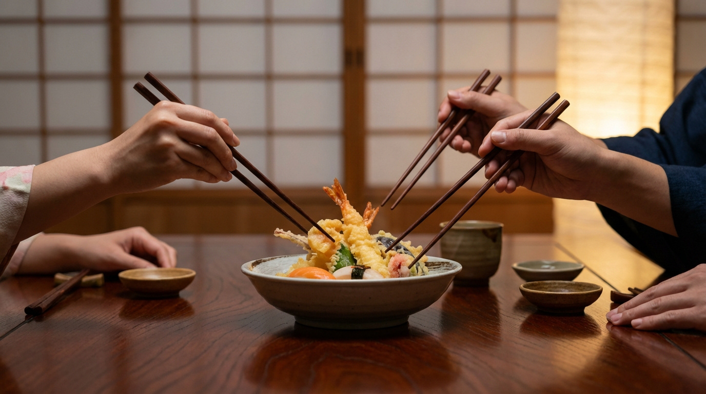 Mains de deux personnes utilisant des baguettes pour partager un plat de tempura varié dans un cadre japonais traditionnel.