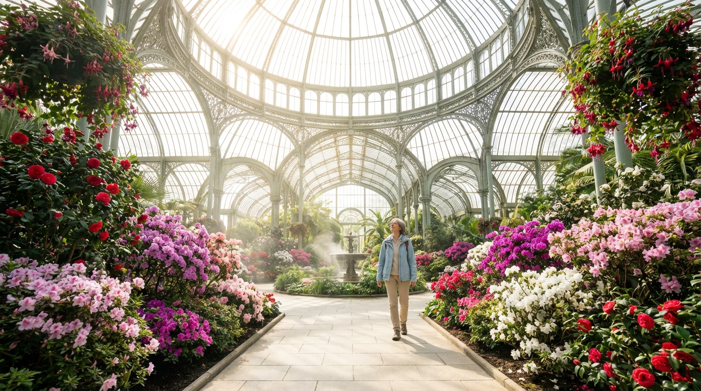 Ouverture limitée à trois semaines en avril. Architecture monumentale en verre et collections de fleurs exotiques rares.